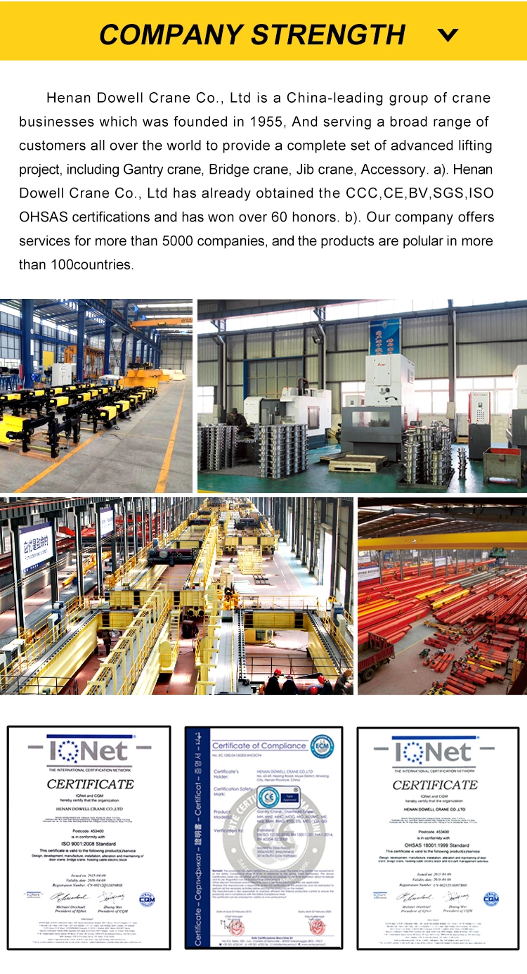 DOWELL CRANE은 30년 이상 크레인 제품을 전문적으로 개발하여 판매 및 시스템 서비스를 통합하여 보다 안전하고 에너지 효율적이며 정밀합니다. 우리의 제품은 전국에 잘 판매하고, 스테이트 그리드와 시노 하이드로 그룹 주식 회사와 협력하고있다. 또한 젬스타 테크놀로지, 리어 코퍼레이션 등 동남아시아 및 기타 해외 시장에 수출하여 높은 새우를 받고 있습니다.